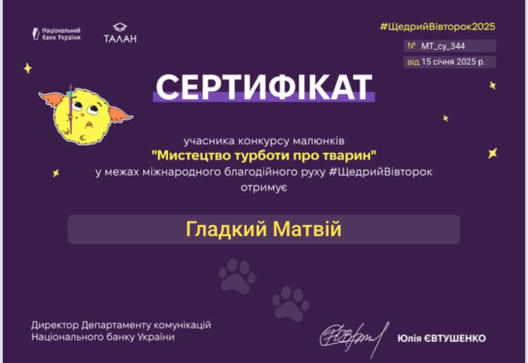 Наші вихованці дошкільного відділення та початкової ланки — це Ситенко Сара, Різоль Назар та Гладкий Матвій брали участь у конкурсі малюнків « Мистецтво турботи про тварин» у межах міжнародного благодійного руху #ЩедрийВівторок# та отримали Сертифікати учасників. Вітаємо !!!