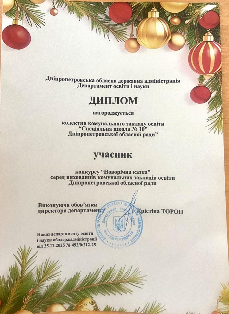 Напередодні Нового року наш заклад брав участь в обласному конкурсі «Новорічна казка» серед вихованців комунальних закладів освіти Дніпропетровської обласної ради. На конкурс були представлені презентації поробок декоративно- ужиткового мистецтва , а також танок та пісня у жестовому виконанні . Колектив нашого закладу нагороджений Дипломом учасника конкурсу « Новорічна казка» серед вихованців комунальних закладів освіти Дніпропетровської обласної ради.