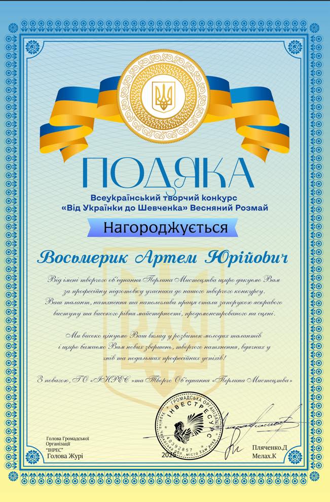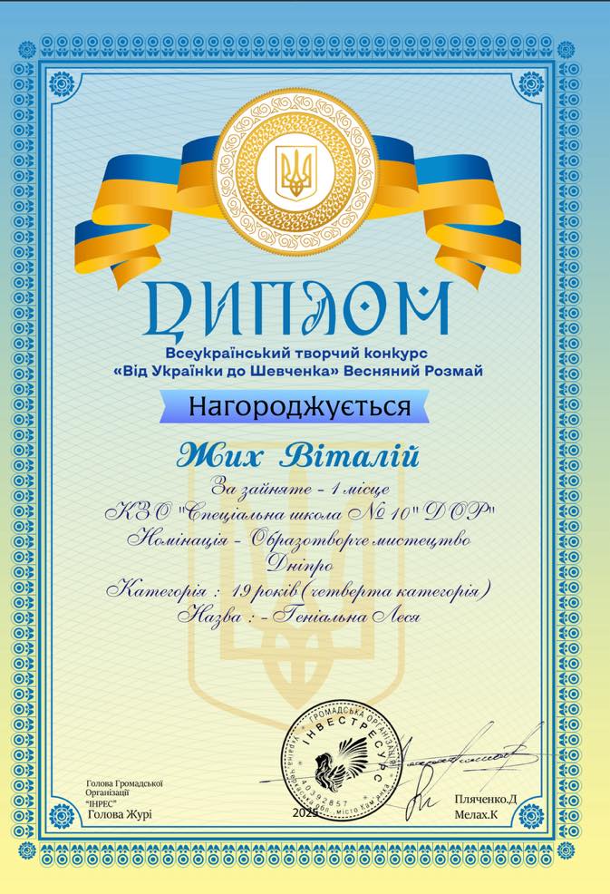 Наш заклад брав участь у Всеукраїнському творчому конкурсі « Від Українки до Шевченка» Весняний Розмай. На конкурс була представлена робота учня 12-А класу Жих Віталія « Геніальна Леся», за яку він отримав диплом за І місце, а його керівник Восьмерик Артем Юрійович отримав подяку за підготовку учня до конкурсу . Вітаємо!!!