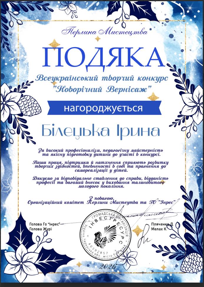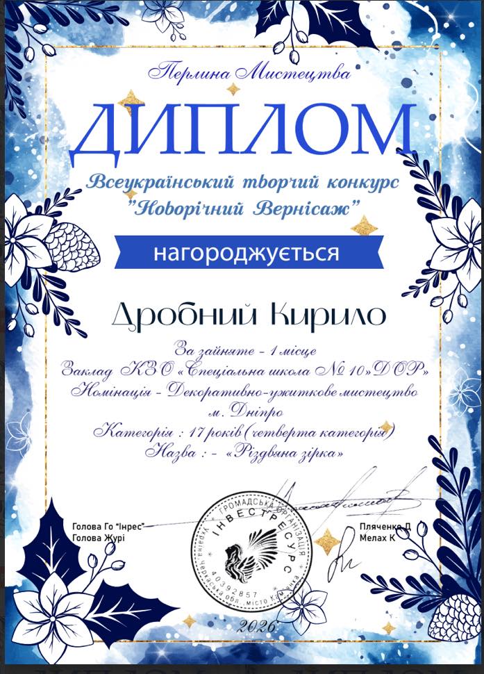 Напередодні Нового року наш заклад брав участь у Всеукраїнському творчому конкурсі « Новорічний Вернісаж». На конкурс була відправлена робота Дробного Кирила, яку він виконав під керівництвом Білецькоі Ірини Михайлівни . Кирил зайняв перше місце , за що нагороджений дипломом, а Ірина Михайлівна отримала подяку за високий професіоналізм, педагогічну майстерність та якісну підготовку дитини до участі в конкурсі.